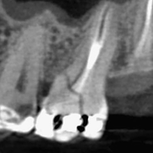 Imagem tomográfica do dente, evidenciando a fratura na mesio-palatina